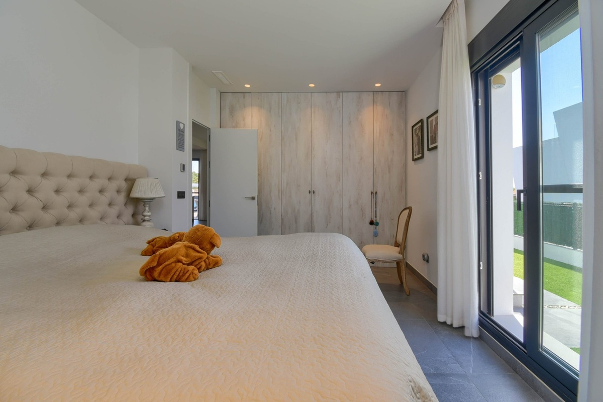 We are pleased to present you this modern and sophisticated villa is located southeast facing in a quiet residential area, with frontal green and mountain views, and lateral views of the sea and the Benidorm skyline. The villa has 2 ensuite bedrooms, and luxuriously finished in detail. Built-in Bose surround sound system inside and out, electric blinds and storage. The kitchen is an open plan island kitchen fitted with quality NEFF appliances including a Circotherm steam oven. Next to the kitchen there is a storage/laundry room with a washer and dryer. Furthermore, this beautiful villa has a fantastic private pool with a mature garden.